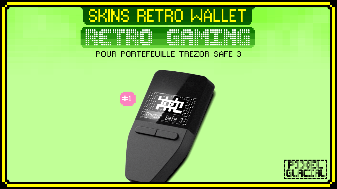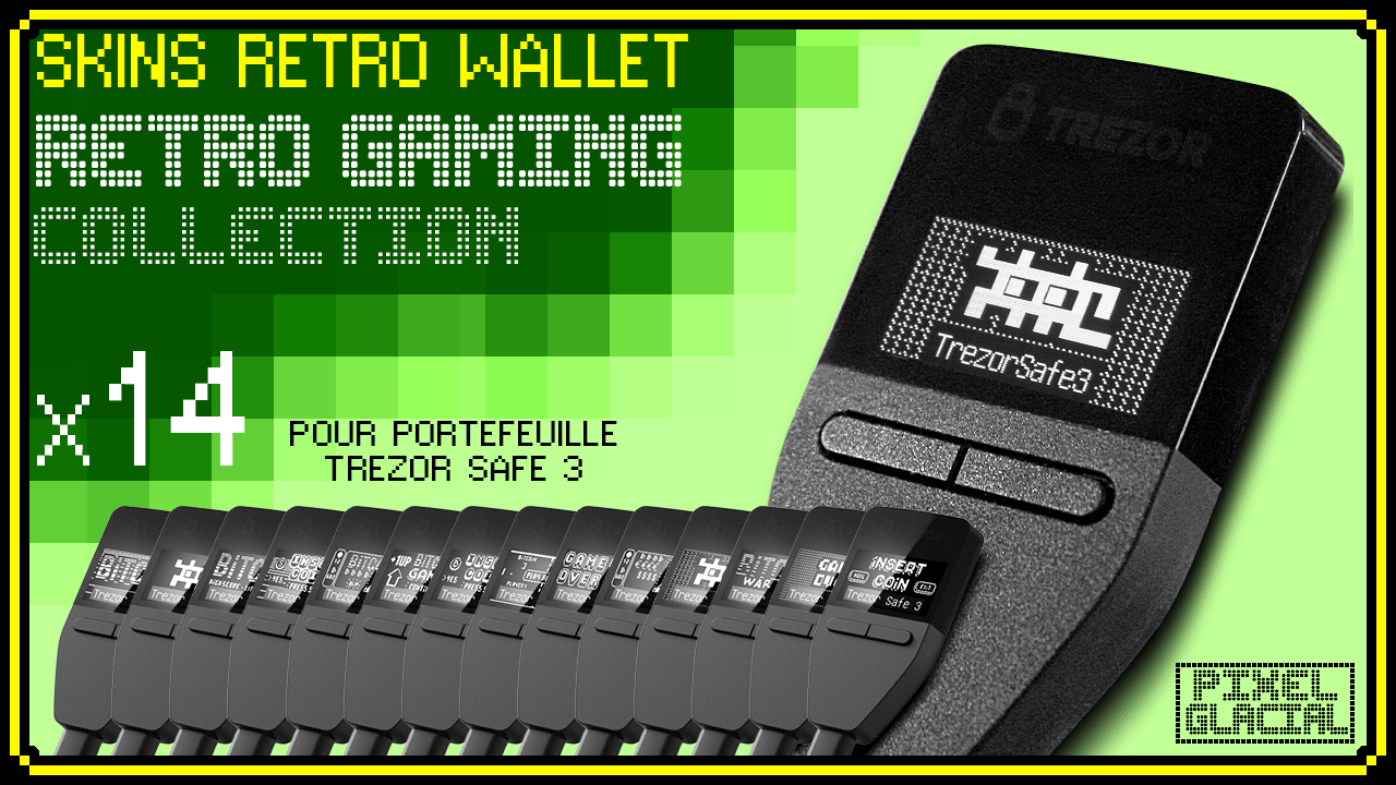 Les Skins Rétro Wallet de chez Pixel Glacial sont une série d’illustrations exclusives et originales conçues pour l’écran monochrome du Trezor Safe 3.