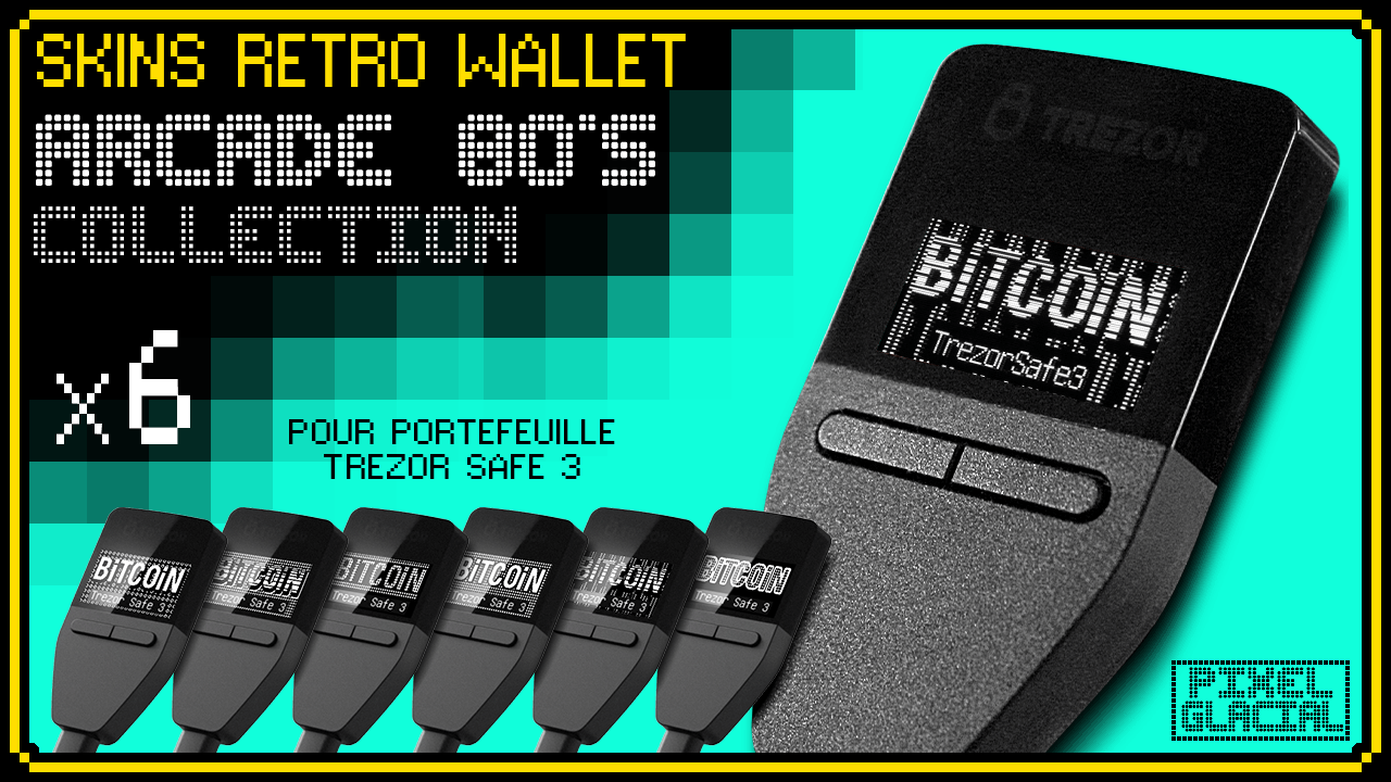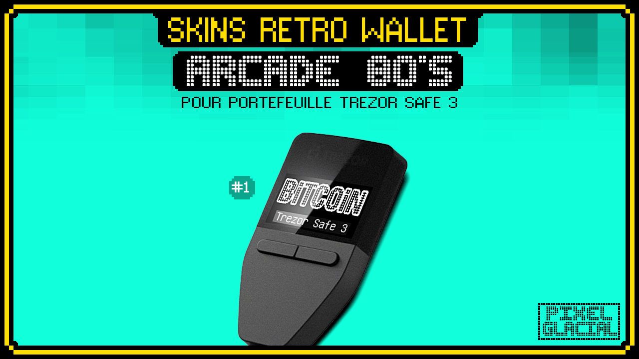 Les Skins Rétro Wallet de chez Pixel Glacial sont une série d’illustrations exclusives et originales conçues pour l’écran monochrome du Trezor Safe 3.
